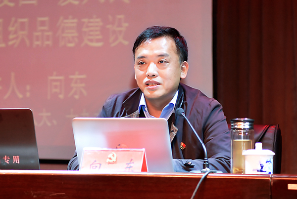 向东以“爱党、爱国、爱人民,加强组织品德建设”为题作报告