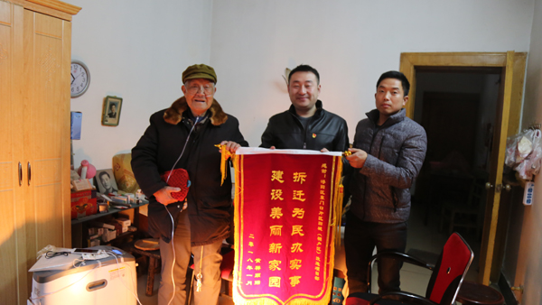 1月16日上午,88岁老人黄祥胜送锦旗感谢白水湖街道东门口片区棚改项目部帮他寻新家,同时项目部工作人员们也感谢这位老人对棚改工作的大力支持。